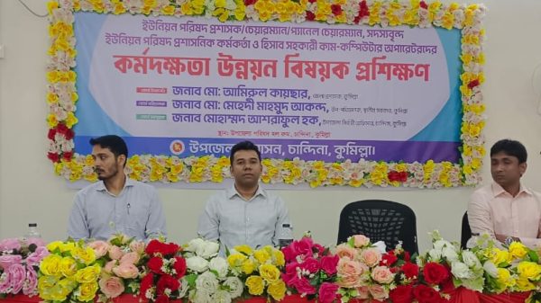 কুমিল্লা জেলা প্রশাসক মো. আমিরুল কায়ছার বলেছেন,আমরা দেশ ও জনগণের স্বার্থে,এলাকার উন্নয়নে কাজ করবো। বুধবার (০৮ অক্টোবর ) সকালে উপজেলা পরিষদ হল রুমে,চান্দিনা উপজেলা প্রশাসন এর আয়োজনে ইউনিয়ন পরিষদ প্রশাসক,চেয়ারম্যান,প্যানেল চেয়ারম্যান, সদস্যবৃন্দ ইউনিয়ন পরিষদ প্রশাসনিক কর্মকর্তা ও হিসাব সহকারী কাম-কম্পিউটার অপারেটরদের কর্মদক্ষতা উন্নয়ন বিষয়ক প্রশিক্ষণ অনুষ্ঠিানে কোর্স উপদেষ্টা প্রধান অতিথির বক্তব্যে তিনি এসব কথা বলেন। এসৃয় উপস্থিত ছিলেন কোর্স পরিচালক স্থানীয় সরকার এর উপ পরিচালক মেহেদী মাহমুদ আকন্দ, কোর্স সমন্বয়ক চান্দিনা উপজেলা নির্বাহী অফিসার,মোহাম্মদ আশরাফুল হক,চান্দিনা উপজেলা সহকারী কমিশনার ভূমি ফয়সাল আল নুর,জেলা প্রশাসক